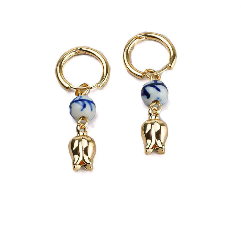 NICKEL FREE and UV RESISTANT. A nice set of gold-colored earrings with a tulip charm on each earring. The earrings also have two hand-painted Delft blue beads, making the earrings a truly Dutch piece of jewelry. The earrings are a beautiful souvenir of your time in the Netherlands or a nice gift for someone abroad with a Dutch connection. Matching necklaces and bracelets are also available.