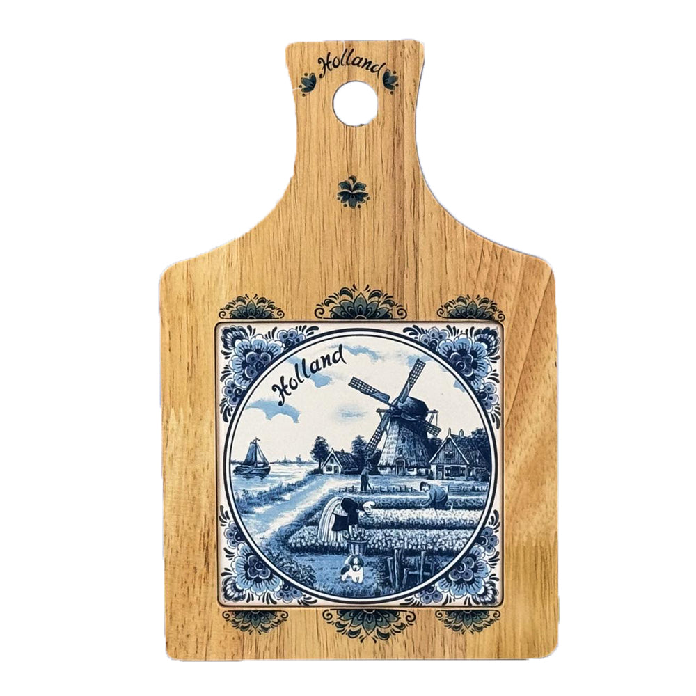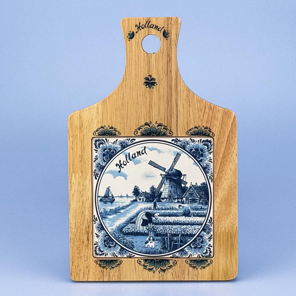 A timeless piece of craftsmanship, this wooden cheese board is beautifully accented with a Delft blue tile, featuring a classic "Holland" motif: a serene windmill nestled beside a blooming tulip field. A charming fusion of rustic wood and delicate ceramic artistry, it adds a touch of Dutch heritage to any spread.